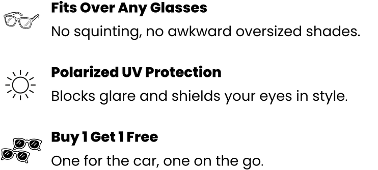 Skip the constant switching - these fit-over shades slide right on over your prescription glasses for instant polarized clarity that cuts glare and sharpens your view. Lightweight, secure, and pressure-free, they stay comfortable for long drives, outdoor days, and everything in between- so you see clearly and stay relaxed all day.