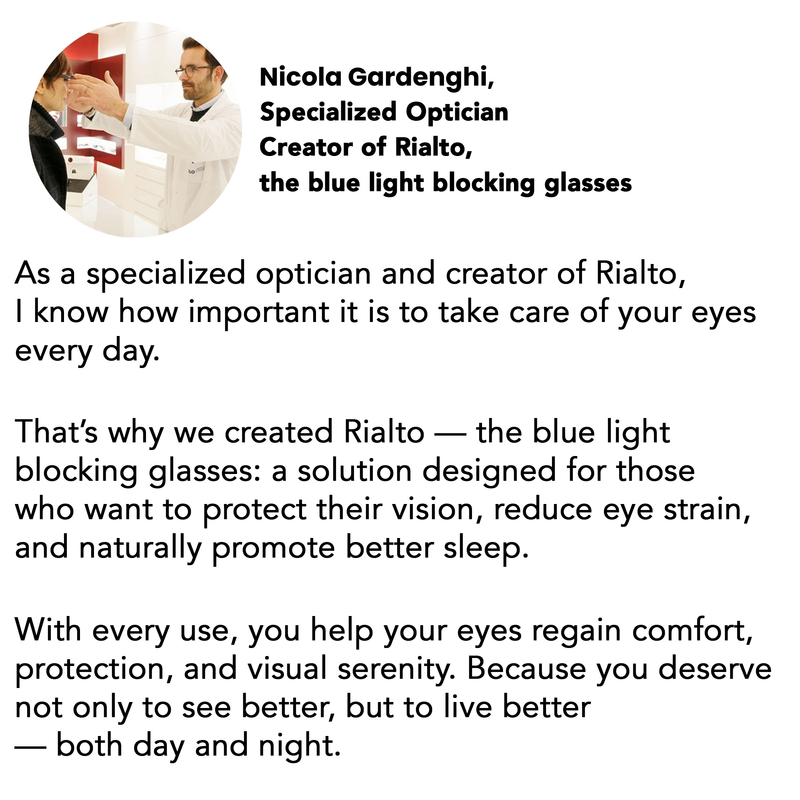 Rialto glasses protect your eyes and help maintain stable serotonin levels, promoting serenity during the day and rest at night.