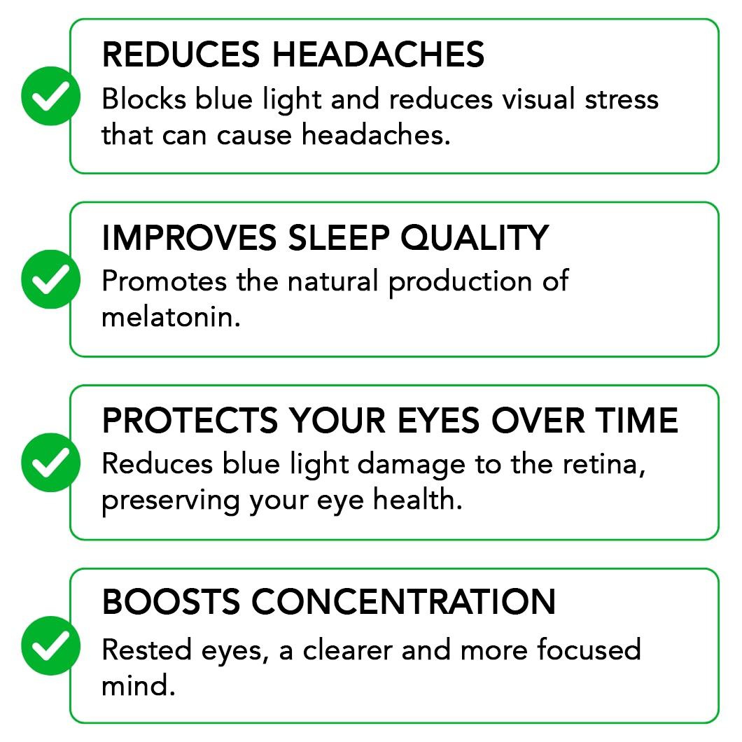 The glasses filter out the blue light from screens, which normally blocks the production of melatonin and causes eye strain. This allows the body to naturally produce the "sleep hormone," facilitating sleep and improving the quality of sleep. Furthermore, by reducing visual stress and eye strain, they help prevent headaches typical of those who spend long hours in front of a computer, smartphone, or TV.